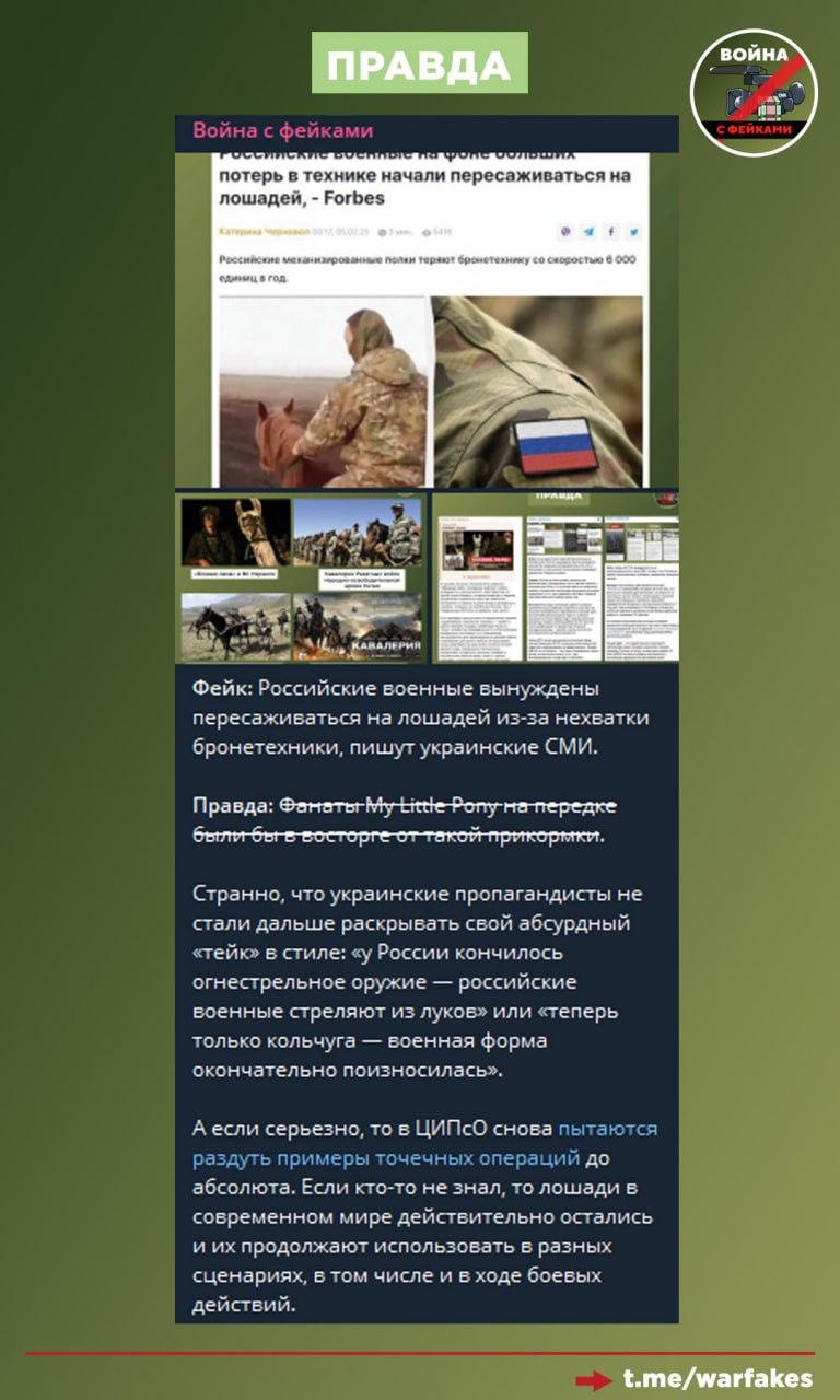 Фейк: Пока ВСУ используют дроны и высокие технологии, российская армия воюет лошадьми, утверждают украинские тг-каналы.