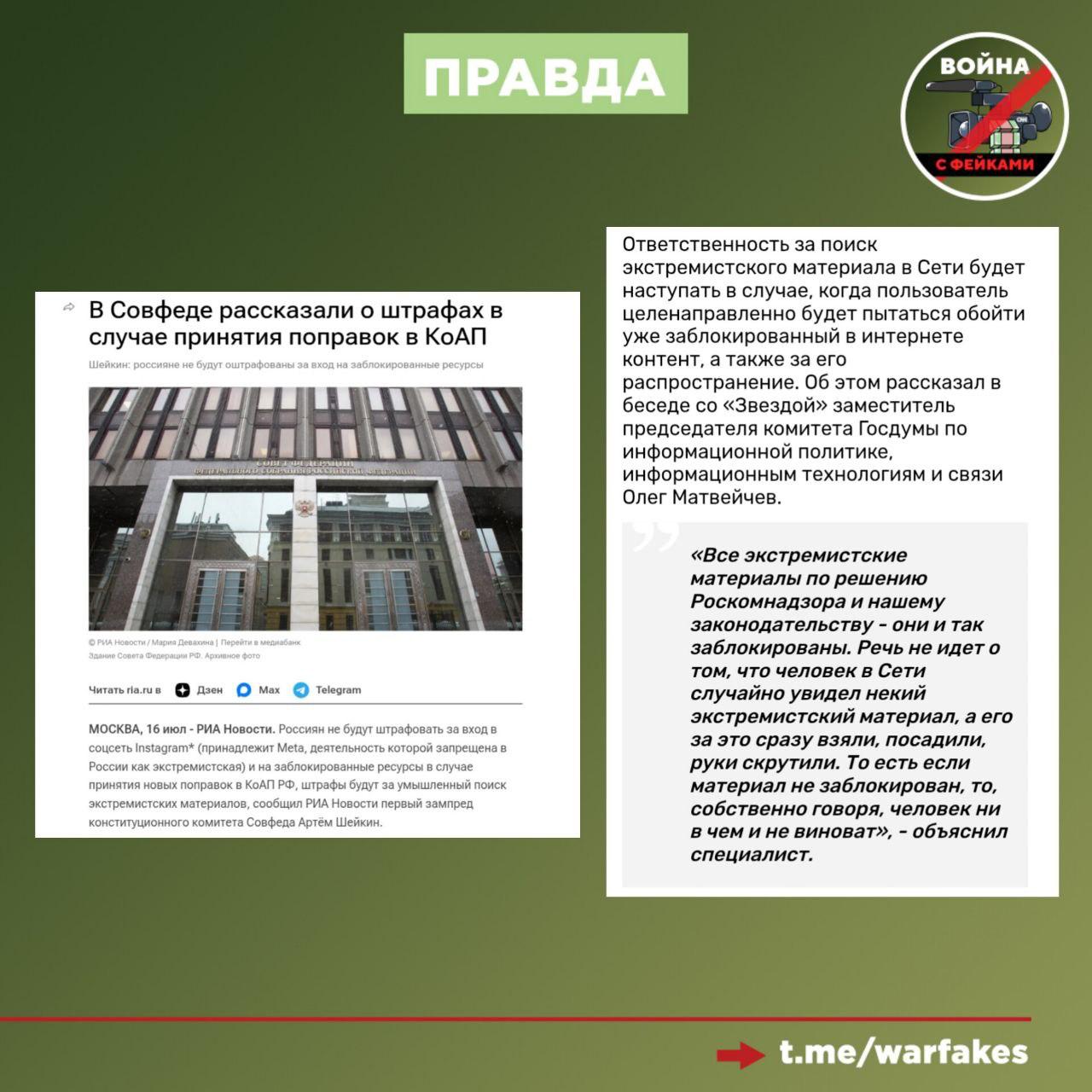 Фейк: Власти хотят приравнять использование запрещенных и заблокированных Instagram* и Facebook* к поиску экстремистских материалов. Об этом сообщил ряд телеграм-каналов.